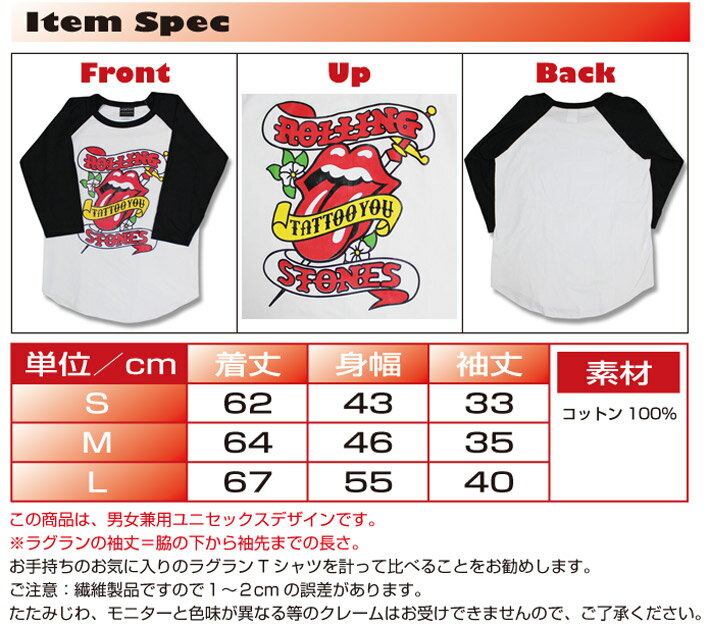 The Rolling Stones( ローリングストーンズ)ラグランTシャツのアイテム説明 【大感謝SALE】海外ライセンス製品 ザ・ローリング・ストーンズの人気デザイン、80年代『TATTOO YOU』がモチーフの七分袖ラグランTシャツです。