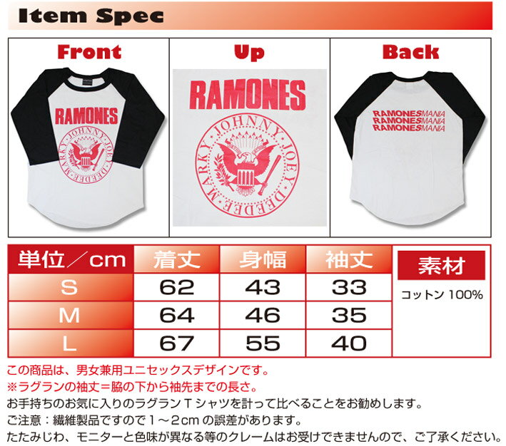 RAMONES(ラモーンズ)ラグランTシャツのアイテム説明 【バーゲン価格!!】海外ライセンス製品 ラモーンズ(RAMONES)の大人気デザイン、スタイリッシュなロック・ラグランTシャツ!! バックプリントもオシャレ!! 素材は、程よい厚さで着心地も最高な七分袖ロック・ラグランTシャツ。
